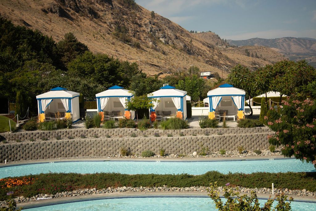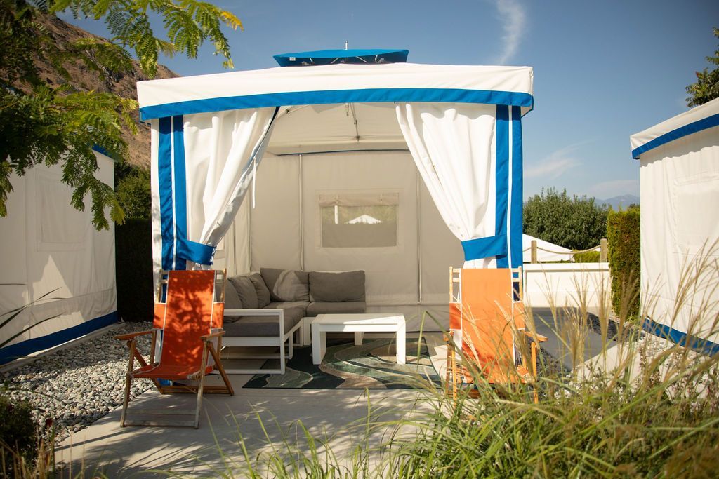 Positioned between the thrilling Downhill Racer slides and the calming Lazy River, these upscale cabanas offer a 10x10 shaded structure and over 150 sq ft of private pad space. Outfitted with quality outdoor furniture, cushioned seats, and two sling loungers, this cabana provides the ultimate mix of relaxation and convenience. Enjoy quick access to multiple attractions while unwinding in a comfortable, elevated retreat designed for large families.